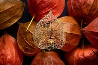"2 generaties lampionnen" is een foto van lampionnen van de lampionplant, waarbij op de nieuwe lampionnen een oude lampion ligt, waar alleen nog het "skelet" van over is. (Op deze oude lampion ligt de scherpte). Een rustig herfst beeld.