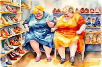 Koop dit digital art kunstwerk 2 gezellige dames hebben veel plezier in de schoenwinkel van De gezellige Dames als reproductie op canvas, aluminium dibond, (ingelijste) fotoprint, behang en ArtFrame, op maat geprint in Fine-Art kwaliteit.