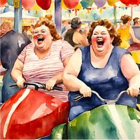 Koop dit digital art kunstwerk 2 gezellige dames in de botsauto's van De gezellige Dames als reproductie op canvas, aluminium dibond, (ingelijste) fotoprint, behang en ArtFrame, op maat geprint in Fine-Art kwaliteit.