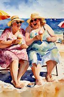 Koop dit digital art kunstwerk 2 gezellige dames met een ijsje op het strand van De gezellige Dames als reproductie op canvas, aluminium dibond, (ingelijste) fotoprint, behang en ArtFrame, op maat geprint in Fine-Art kwaliteit.