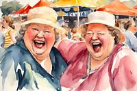 Koop dit digital art kunstwerk 2 gezellige dames met hoed op de kermis van De gezellige Dames als reproductie op canvas, aluminium dibond, (ingelijste) fotoprint, behang en ArtFrame, op maat geprint in Fine-Art kwaliteit.