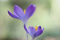 2 krokussen in het gras. De zon op de achtergrond en de overbelichting zorgen voor pasteltinten.