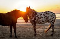 Een donkerbruin en een stippeltjespaard op het strand in Vrouwenpolder, Zeeland tijdens de zonsondergang. De zon staat inmiddels zo laag dat deze mooi achter de paarden vandaan schijnt en de foto een hele warme en zachte sfeer geeft.