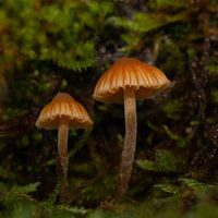Het is herfst, 2 kleine paddenstoelen staan fier in het mos.
