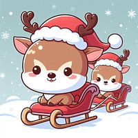 Het'is Kerstmis! Verspreid de kerstsfeer met deze schattige illustratie met 2 rendieren met kerstmutsen op die plezier hebben in een slee.