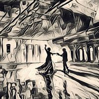 Onderdeel van een vierluik. Dit stoere werk is gemaakt in beige tint met donkergrijs tot zwart. Het werk is abstract van aard. Het thema van het vierluik is "dansen in de fabriek" Als je goed kijkt zie je de vakwerkliggers in de plafond constructie. Dit dansende stel heeft alle ruimte in deze stoere verlaten fabriekshal.