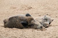 Deze 2 zwijnen liggen heerlijk te relaxen in het zand.