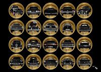 20 klassieke auto's op een poster die zijn gebouwd binnen 50 jaar van 1936 tot 1986.
