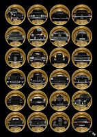 24 klassieke auto's op een poster die zijn gebouwd binnen 50 jaar van 1936 tot 1986.