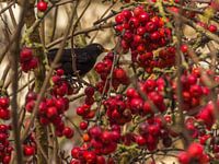De rode bessen hebben, zeker nu bij gebrek aan meer felle kleuren, een aantrekkingskracht naar vogels. Deze merel komt even kijken of er wat naar zijn smaak bij is.