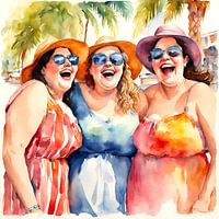 Koop dit digital art kunstwerk 3 gezellige dames onder palmbomen van De gezellige Dames als reproductie op canvas, aluminium dibond, (ingelijste) fotoprint, behang en ArtFrame, op maat geprint in Fine-Art kwaliteit.