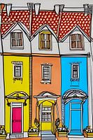 Kleurige printen, abstract, figuratieve illustraties met afbeeldingen van huizen, grachtenpanden uit diverse landen en steden.