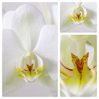 3 macro foto's van een witte orchidee.