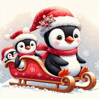 De afbeelding is een digitale weergave van een kunstwerk met kerstthema met twee pinguïns met rode sjaals en kerstmutsen. De pinguïns zitten op een slee met sneeuwvlokken om hen heen. Omarm de magie van de winter, waar vreugde te vinden is in de eenvoudigste momenten.