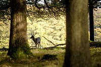 een hert op de veluwe, gespot door de bomen door. De bomen geven de foto diepte. Je ogen worden automatisch naar het hert geleid. prachtig toch!