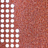 32 Ronde, witte gaten puntsgewijs bij elkaar in een roestige metalen plaat maken samen een levendig abstract en minimalistisch beeld. Door het ontbreken van twee gaten in de reeksen en de nog niet gebruikte ruimte, lijkt het een proces dat mogelijk nog bezig is. Of is goed, klaar, zoals het is