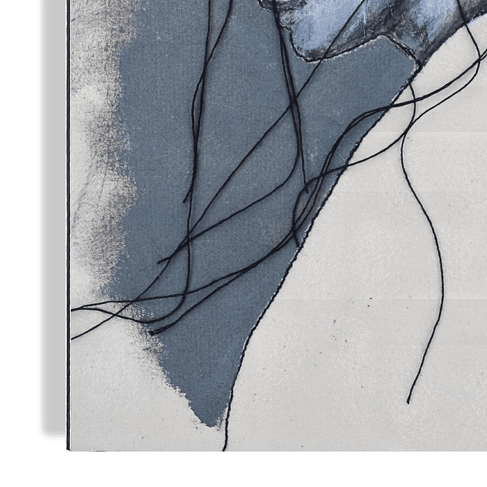 Een figuratieve tekening van draad en acryl in de kleurtonen zwart-wit en grijs.