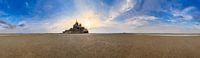 Prachtige 360 graden panoramische opname van middeleeuws monument historique Le Mont Saint-Michel in Bretagne, Frankrijk, tijdens zonsondergang vanaf het wad tijdens laagwater