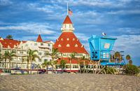 Een mooie, met wolken gevulde middag op Coronado Central Beach in Coronado, Californië, VS. Op de achtergrond staat het historische en geliefde Hote Del Coronado.