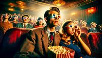 In mijn werk "3D Liefde" neem ik je mee terug naar een nostalgisch moment in de bioscoop, waar een eerste date plaatsvindt. Dit schilderij vangt de opwinding en het avontuur van jonge liefde, gevangen in de sfeer van een vintage bioscoopsetting.