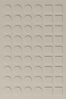 Een reliëf van herhalende cirkels en vierkanten, uitgevoerd in een monochroom tint.