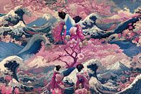 abstracte collage met elementen van traditionele typische japanse oosterse kenmerken met sterke contrasten in onderwerp,kleur en structuur.
