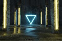 Over ‘3d rendering van blauwe verlichte driehoeksvorm naast betonnen pil’ van Besa Art