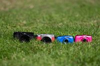 4 camera's in het gras. Alle camera's voor een gezin van pappa, mamma en twee kinderen. Leuk voor aan uw muur