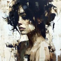 Abstract portret van een vrouw in een verweerde gefragmenteerde grunge stijl met grove verf penseelstreken op een korrelige hout en canvas textuur.