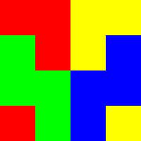 Van vier kleuren is elke kleur vier keer aanwezig (kleine vierkantjes). Deze 16 (4x4) vierkanten zijn zo gerangschikt dat ze een groot vierkant vormen.