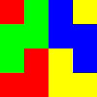 Van vier kleuren is elke kleur vier keer aanwezig (kleine vierkantjes). Deze 16 (4x4) vierkanten zijn zo gerangschikt dat ze een groot vierkant vormen.
