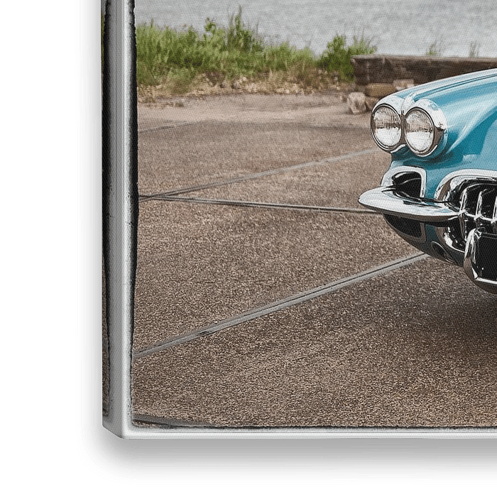 Chevrolet Corvette C1 uit 1959 gefotografeerd op het terrein van NDSM met het IJ op de achtergrond. Volledig gerestaureerde auto. Deze versie heeft een sierrand om de foto heen.