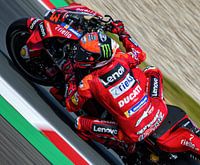 Tijdens de kwalificatie van de MotoGP in assen dook Francesco Bagnaia in de bocht en leunde hij zijwaarts.