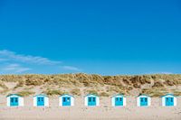 7 blauw/witte strandhuisjes in rij op het strand van Texel tegen duinenrij.