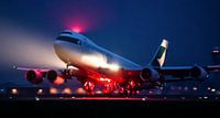 Boeing 747 in de nacht met mooie lichten op het toestel, lage sluitertijd en wat geluk en dan komt de plaat er zo uit.