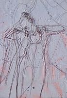 Een werk van bruin draad op plastic, een vrouwelijk figuur met neergeslagen blik.