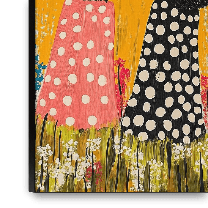 "A Glimpse Beyond the Yellow Field" captures a serene scene of three girls, each with flowing black hair, standing side by side in a vast yellow meadow. Their backs are turned to the viewer as they gaze beyond the vibrant sea of wildflowers and grasses. The girls wear playful polka-dotted dresses, their colors contrasting beautifully…
