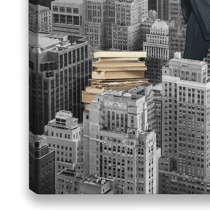 Surrealistische collage. Een keurige heer leest zijn lectuur op de daken van wolkenkrabbers.