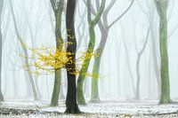 Mistig bos in de winter met de laatste bladeren nog in kleur