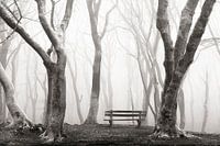 Bankje met uitzicht op een mistig en sfeervol bos in monochroom tint