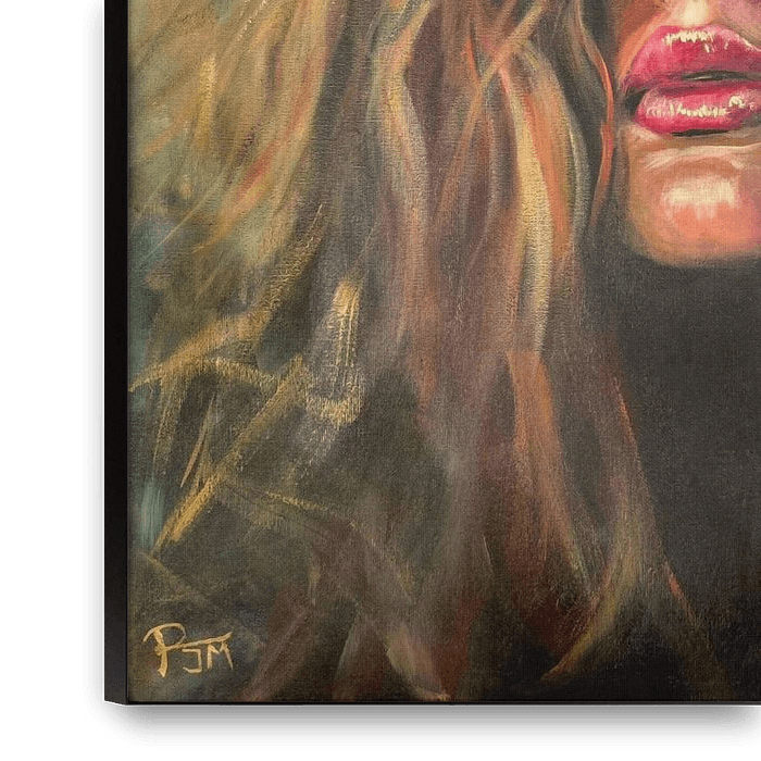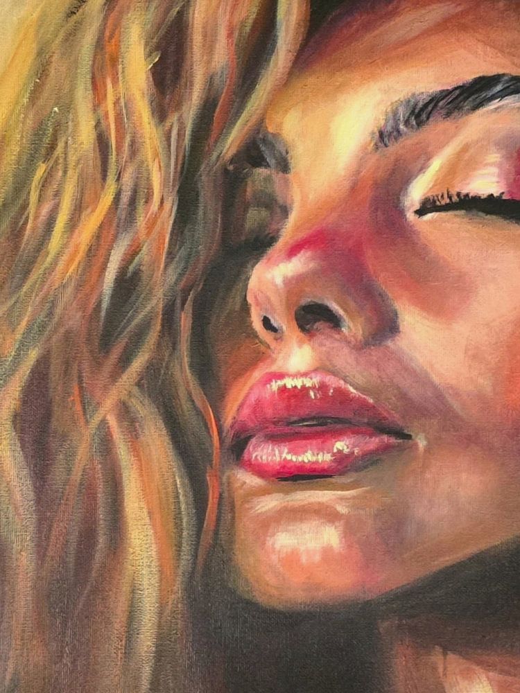 Dit portret schilderde ik met het gevoel van een stil moment net na zonsopkomst – wanneer de wereld nog zacht en rustig aanvoelt en de dag vol belofte lijkt. Het licht dat haar gezicht raakt en de losse beweging van haar haar geven een gevoel van zachtheid, maar ook van innerlijke kracht.