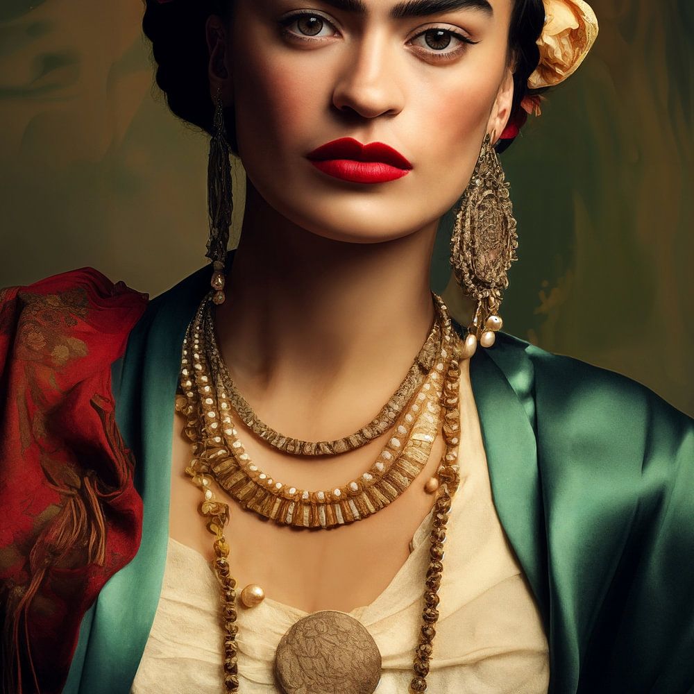 Portret van een mooie vrouw. Nostalgisch en romantisch. Kleurrijke bloemen in het haar en een diepgroene achtergrond zorgen voor een subtiel geheel. Mooie kettingen en een zijden blouse. Passend bij diverse stijlen en trends. Artist: Bianca ter Riet.