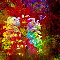 Een roodachtige avond voor een scharnierbloem, is een abstract, kleurrijk werk. voor een evenzo kleurrijke Scharnierbloem. Deze grote bloem staat centraal in dit werk. Het bos bos is rood gekleurd door de zonsondergang. De grote bloem krijgt bezoek van een vlinder. De kleuren gebruikt in dit vrolijke, optimistische werk zijn, rood, geel, blauw, groen, wit en magenta.