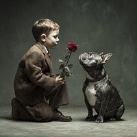 Hartverwarmend portret van een klein jongetje in een bruin pakje dat een rode roos aanbiedt aan een grijze Franse bulldog, beide met een lieve en nieuwsgierige uitdrukking tegen een donkere achtergrond.