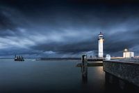 Een opname van de vuurtoren bij de haven van Hellevoetsluis tijdens een stormachtige avond.