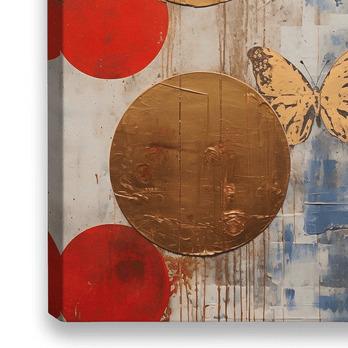 A Touch Of Gold #VII is een digitaal schilderij in abstracte expressionistische stijl. Het kleurenpallet is opgebouwd uit verschillende tinten royaal blauw, rood en goud. Het werk geeft een moderne rustieke uitstraling aan uw interieur!