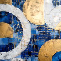 A Touch of Gold #XXI is een digitaal schilderij in abstracte expressionistische stijl. Het kleurenpallet is opgebouwd uit verschillende tinten royaal blauw, wit en goud. Het werk geeft een moderne rustieke uitstraling aan uw interieur!