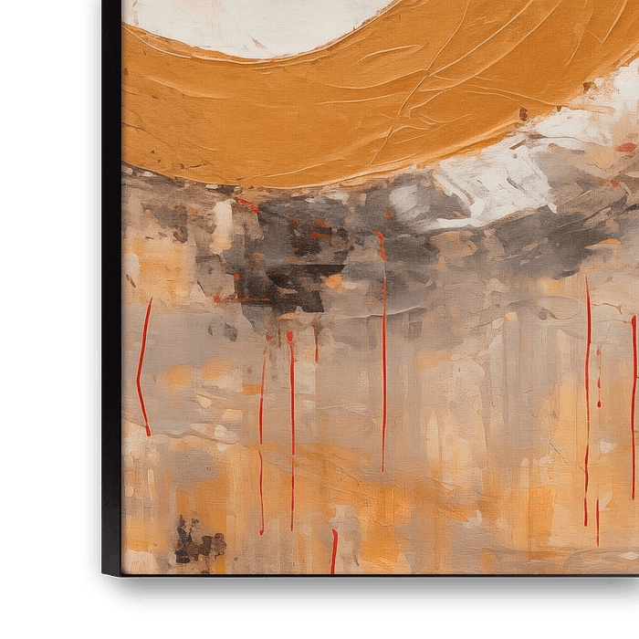 A Touch of Gold #XXVII is een digitaal schilderij in abstracte expressionistische stijl. Het kleurenpallet is opgebouwd uit verschillende tinten royaal oranje, wit en goud. Het werk geeft een moderne rustieke uitstraling aan uw interieur!