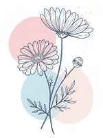 Deze prachtige kunstdruk heeft een minimalistische lijntekening van twee tere madeliefjesbloemen en een ontluikende bloei, tegen een achtergrond van zachte, abstracte pastelkleurige cirkels in blushroze en hemelsblauw. De strakke, elegante lijnen van de bloementekening creëren een gevoel van rust en eenvoud, terwijl de aquarelachtige…