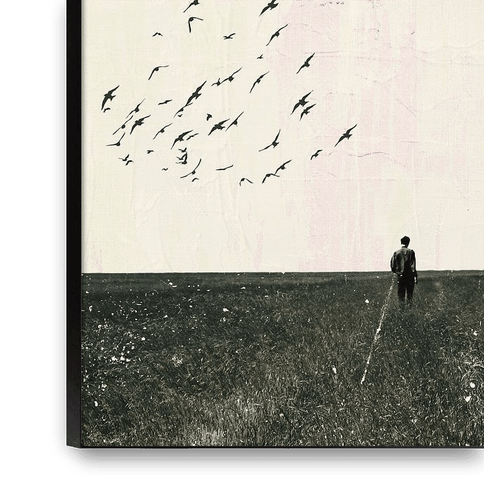Surrealistische collage print. Het is een idyllisch plaatje: een man wandelt door een grasveld en vogels vliegen door de lucht. Die lucht bestaat echter uit diverse texturen. Er zijn in deze surrealistische print diverse lagen en texturen over elkaar gebruikt en samengevoegd, waaronder diverse foto's, acrylverf texturen en een vintage…